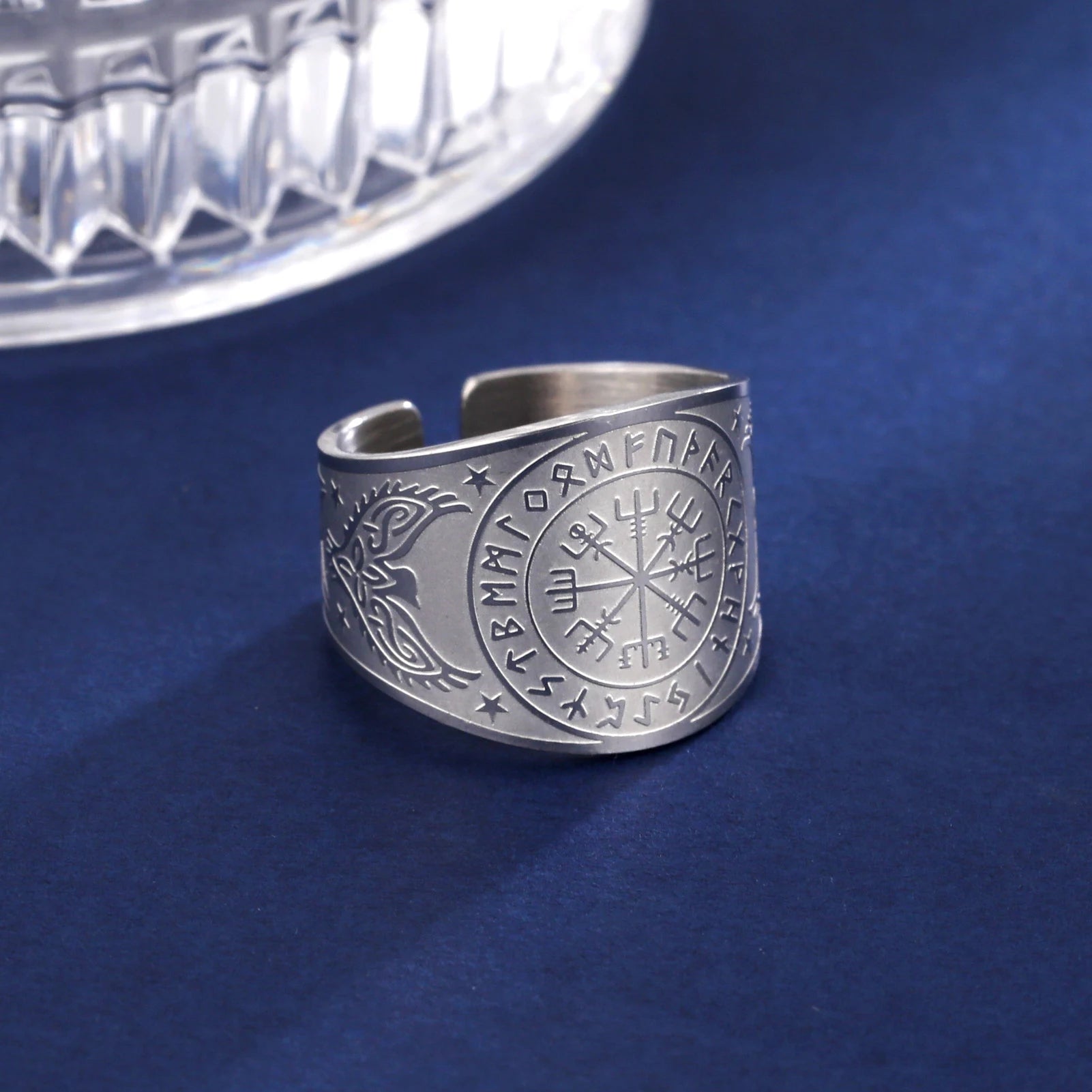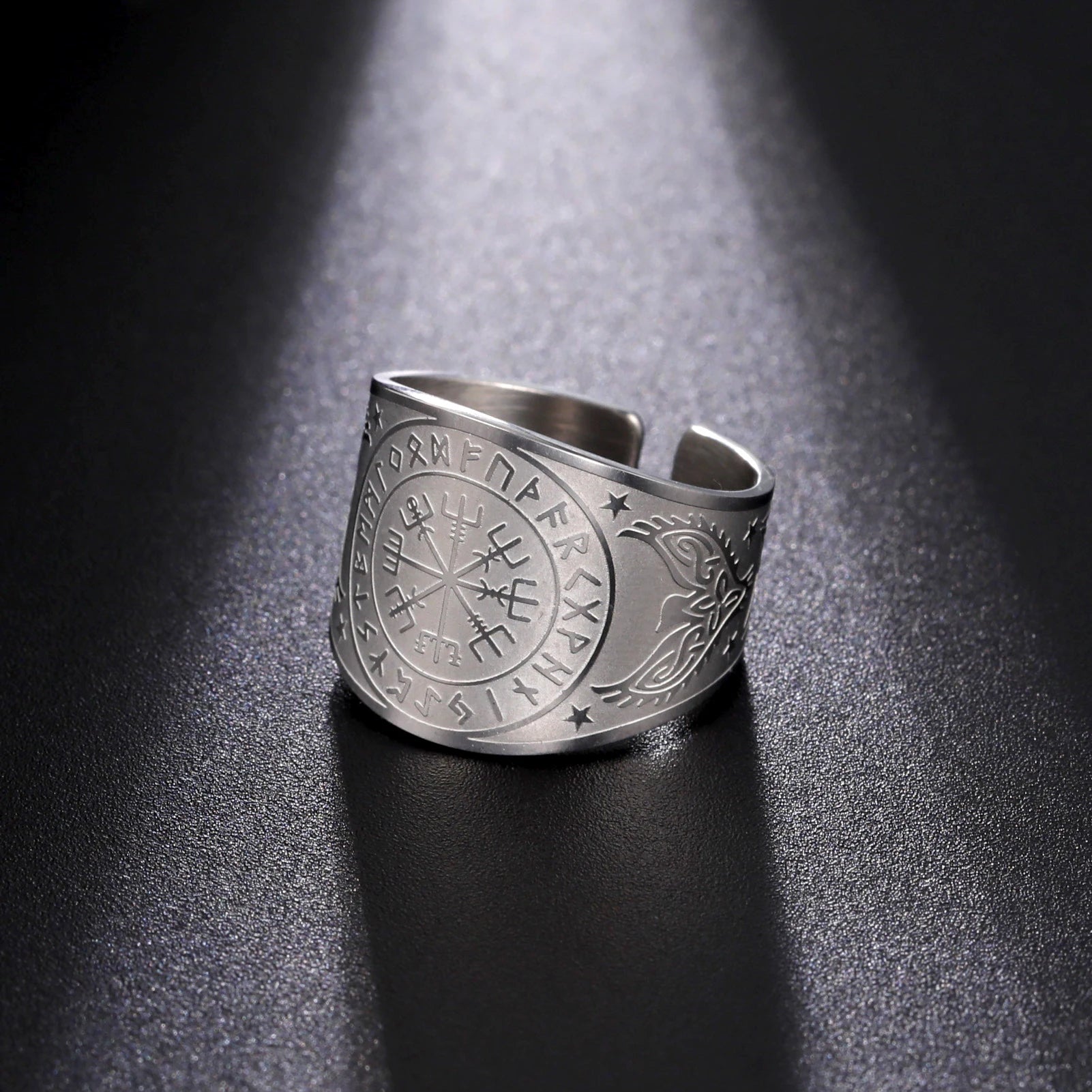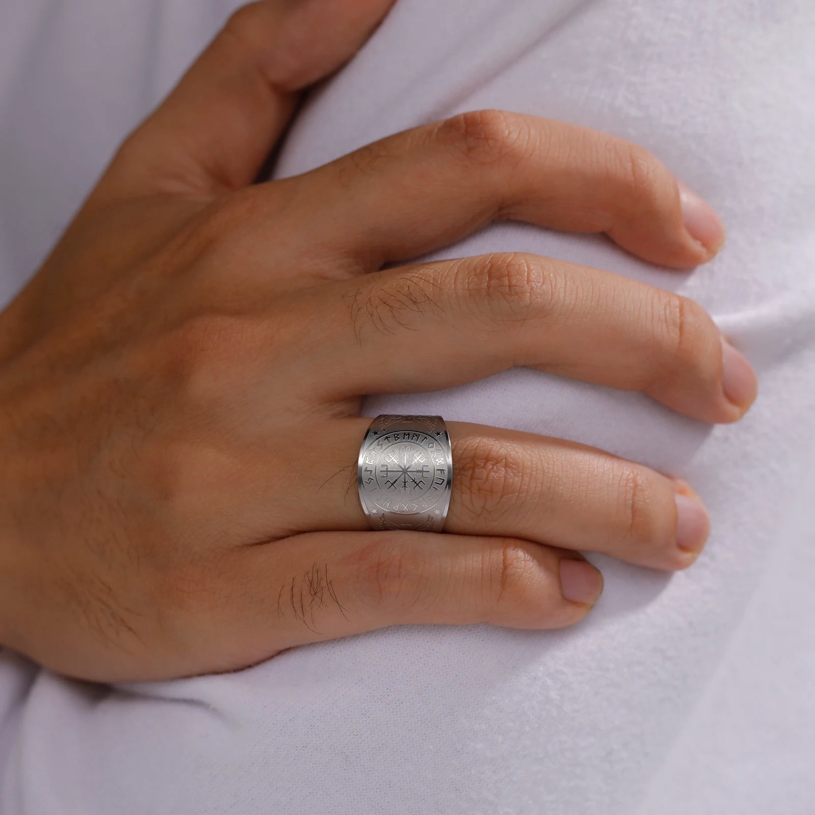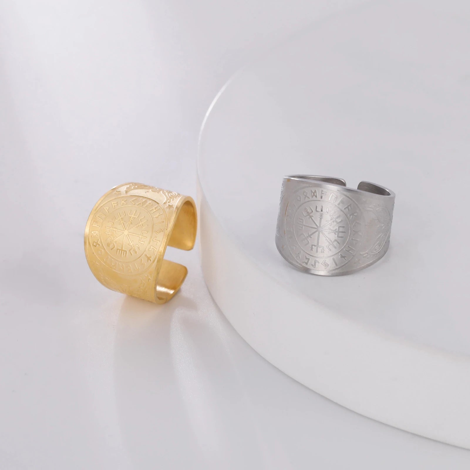 LIKGREAT Viking Compass Vegvisir Ring Helm of Awe Nordic Rune Scandinavian Amulet Stainless Steel Jewelry New Year Gift